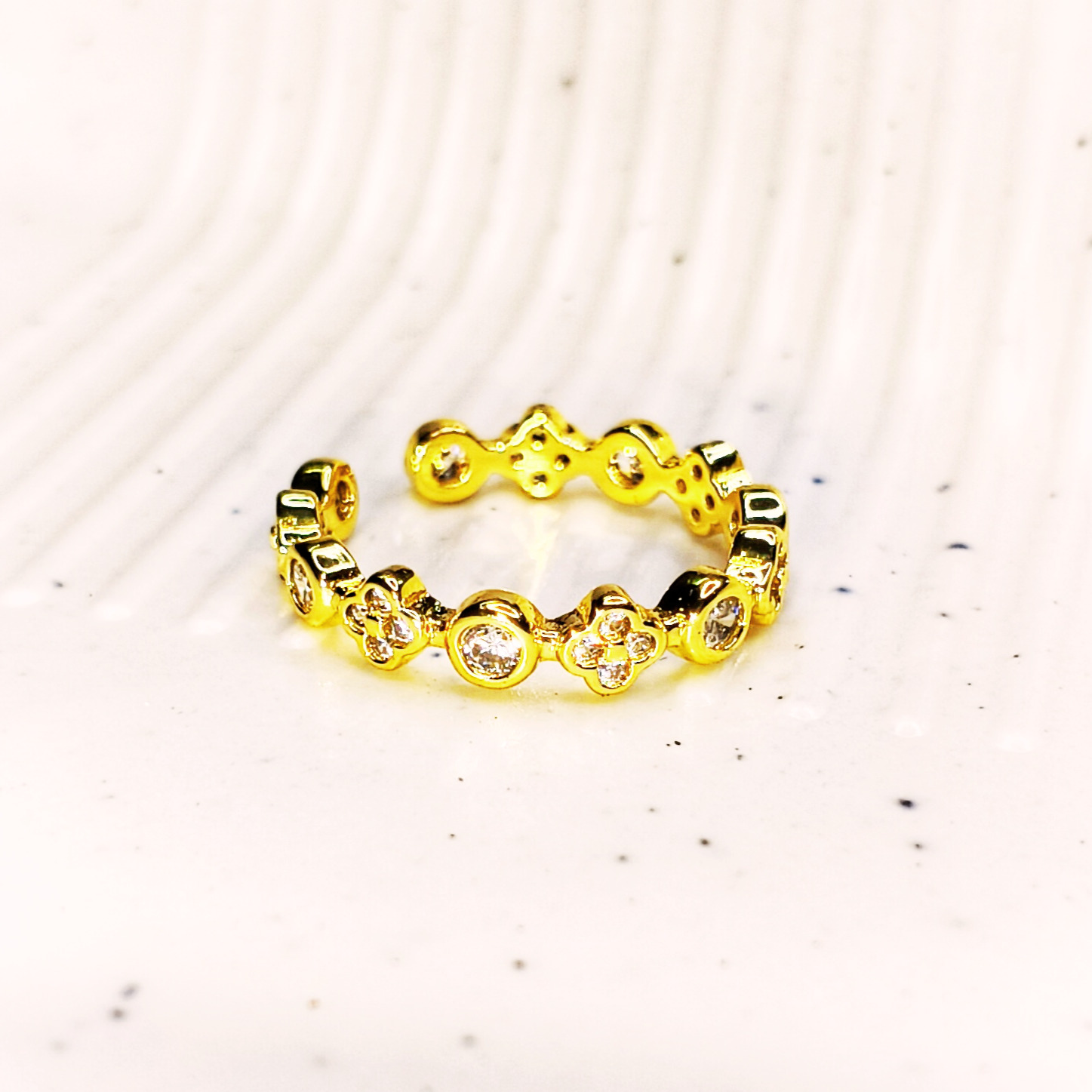 Description: A delicate band adorned with alternating floral motifs and shimmering stones, crafted to add a soft, feminine sparkle. Perfect for stacking or wearing solo for an elegant everyday look.