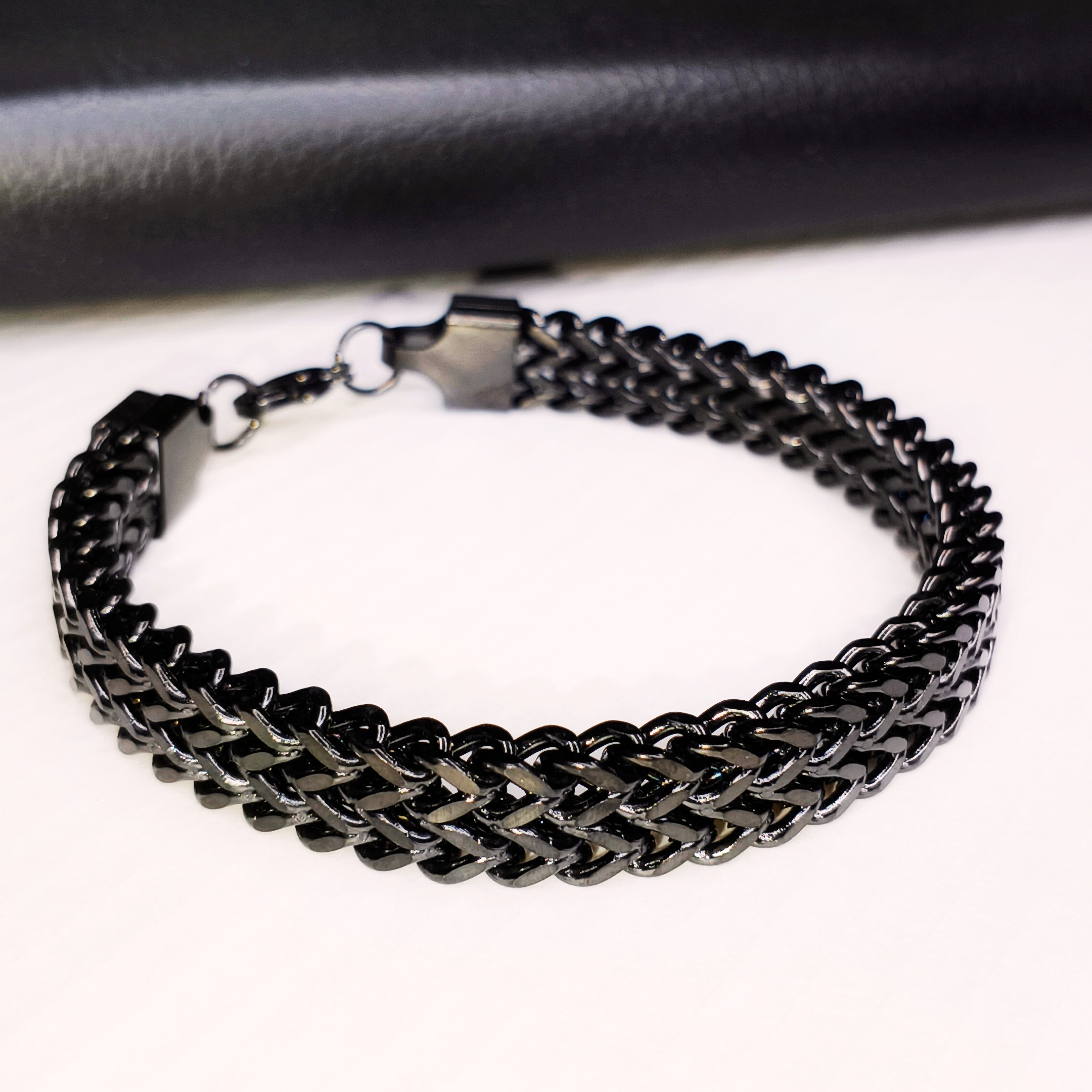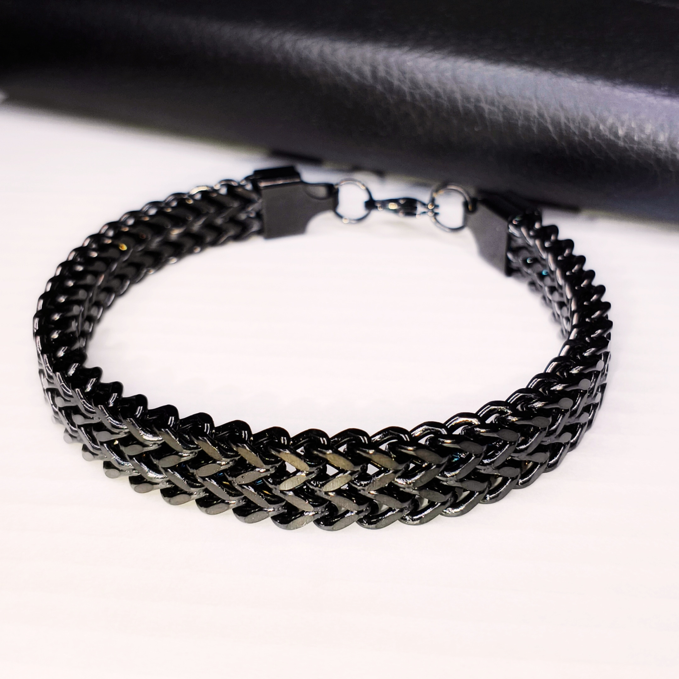 Description: A flat chain bracelet finished in a bold black polish, designed for a clean and modern look. Minimal, versatile, and perfect for everyday styling.