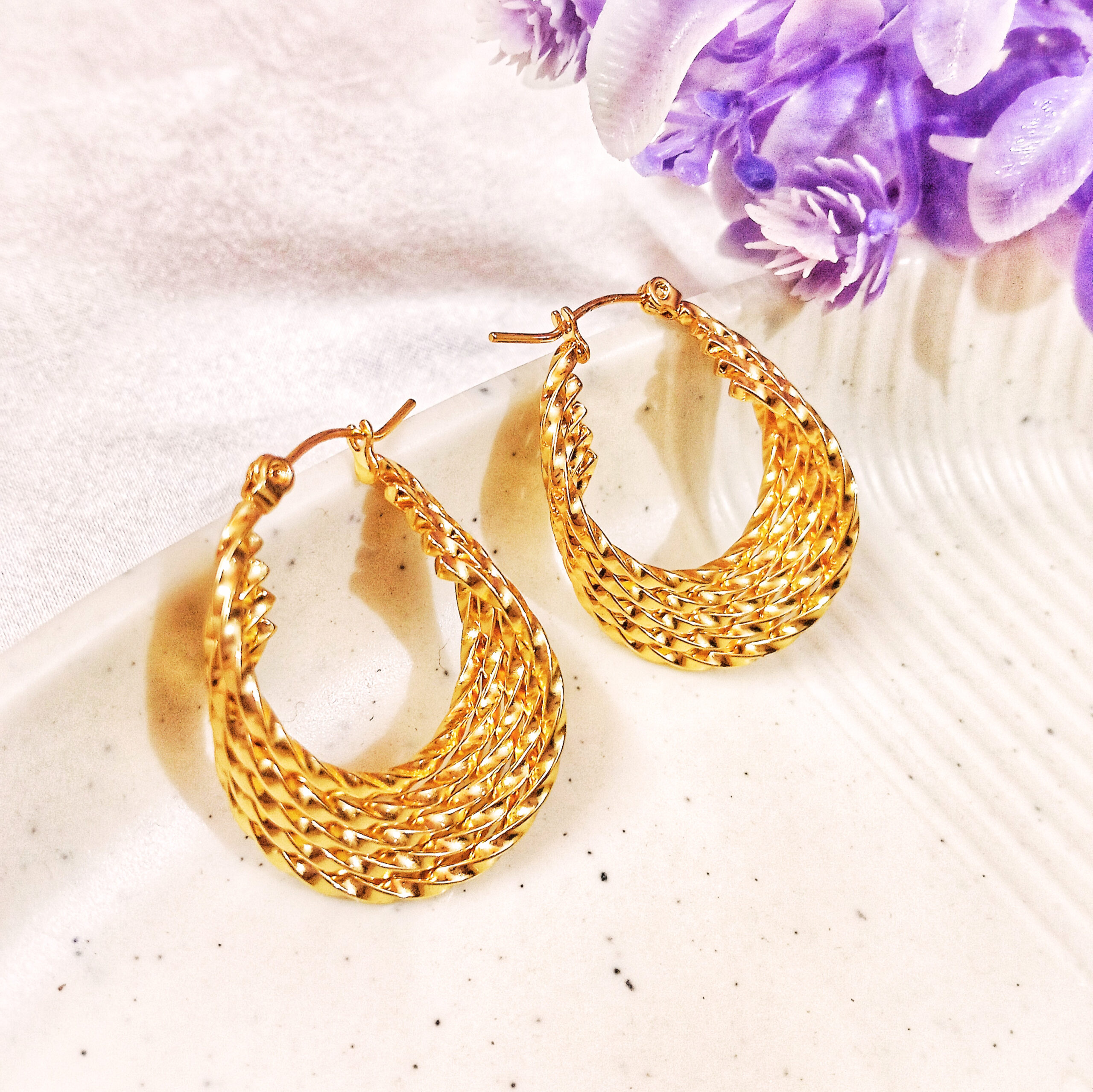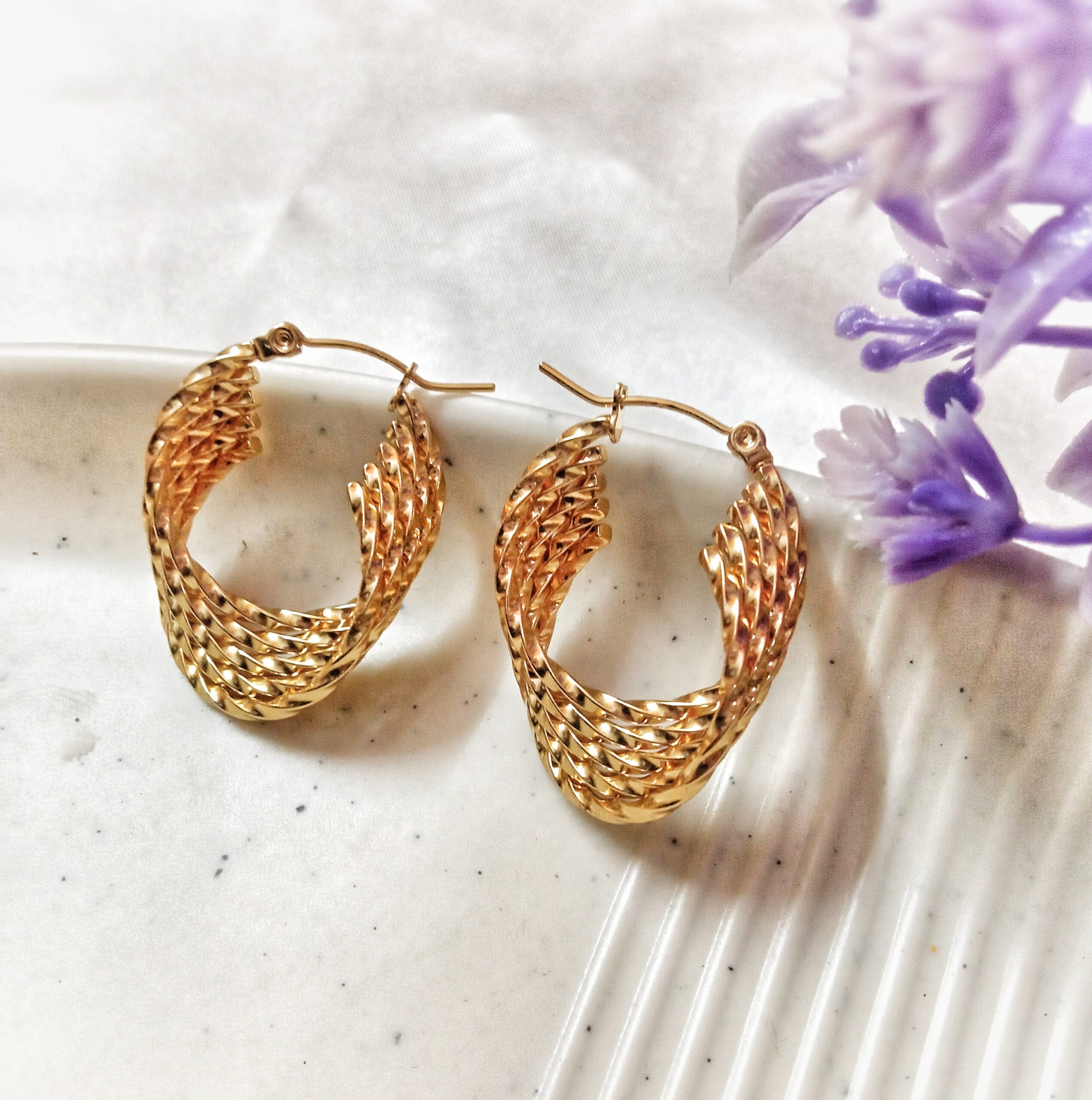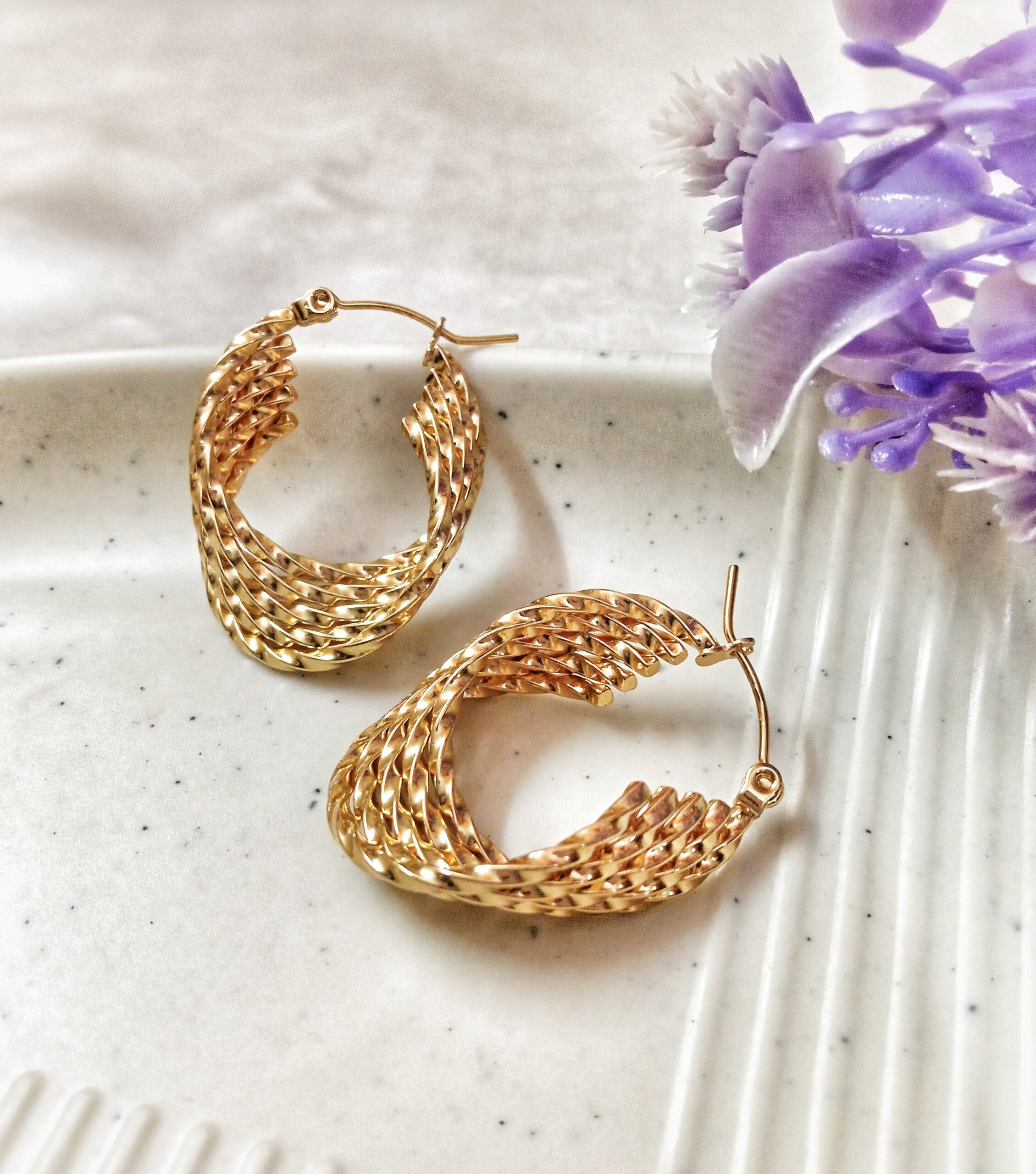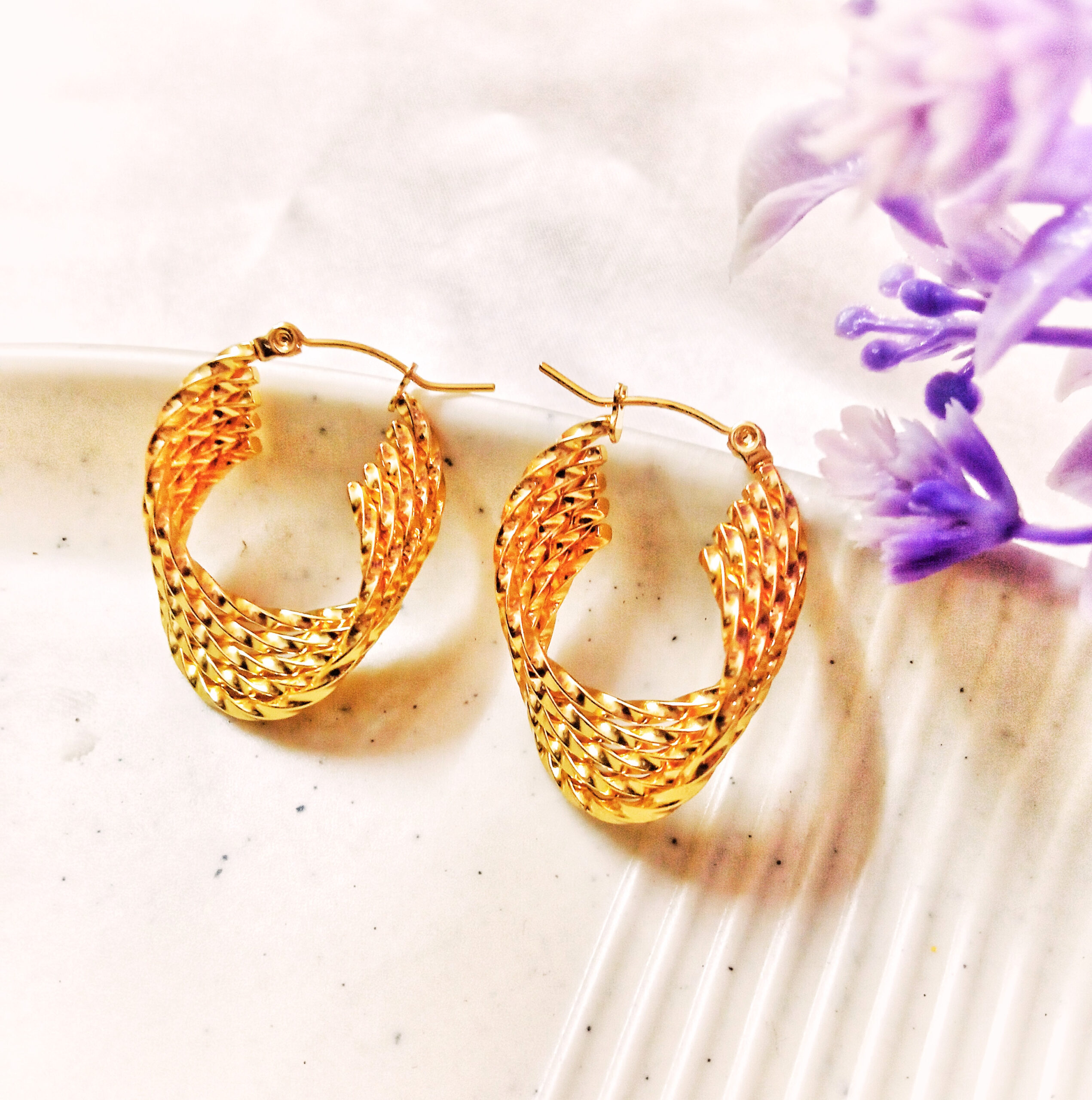 Description: Delicately crafted with a rope-like twisted texture, these hoops redefine elegance with a modern touch. Lightweight yet striking, they’re the perfect everyday statement.